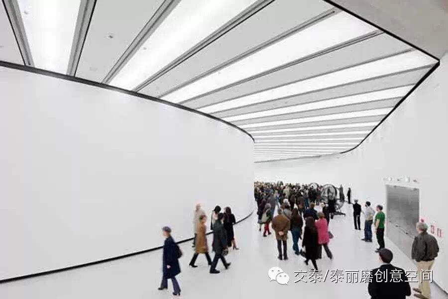 设计师把博物馆走廊的天花板设计成叠加的流线状,如同交通枢纽一般,规矩又灵活。用间隔的灯光创造独特的律动感和流动感,波浪形的天花板极具未来主义之风。