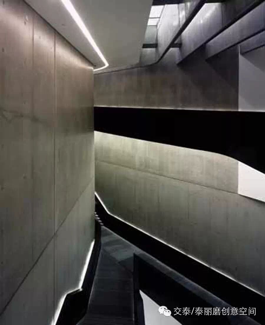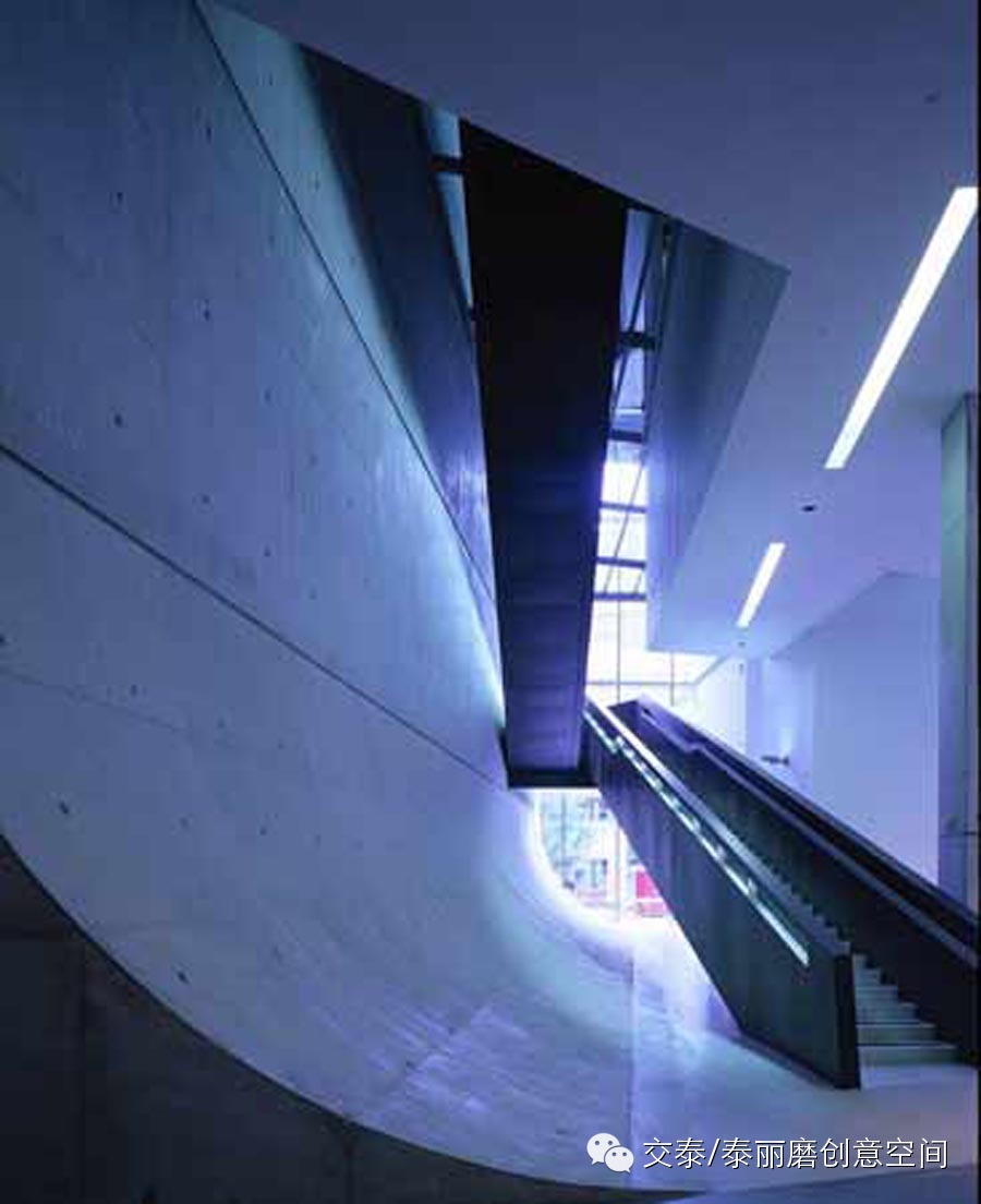 设计师巧妙地将楼梯设计在大楼后部的巨大裂缝中,没有采用隔墙将行进中的人与展馆隔开,而是采用“之”字形恰到好处地连接了建筑内部错综复杂的空间,这种开放的空间使参观者始终与展馆保持着密切的联系。