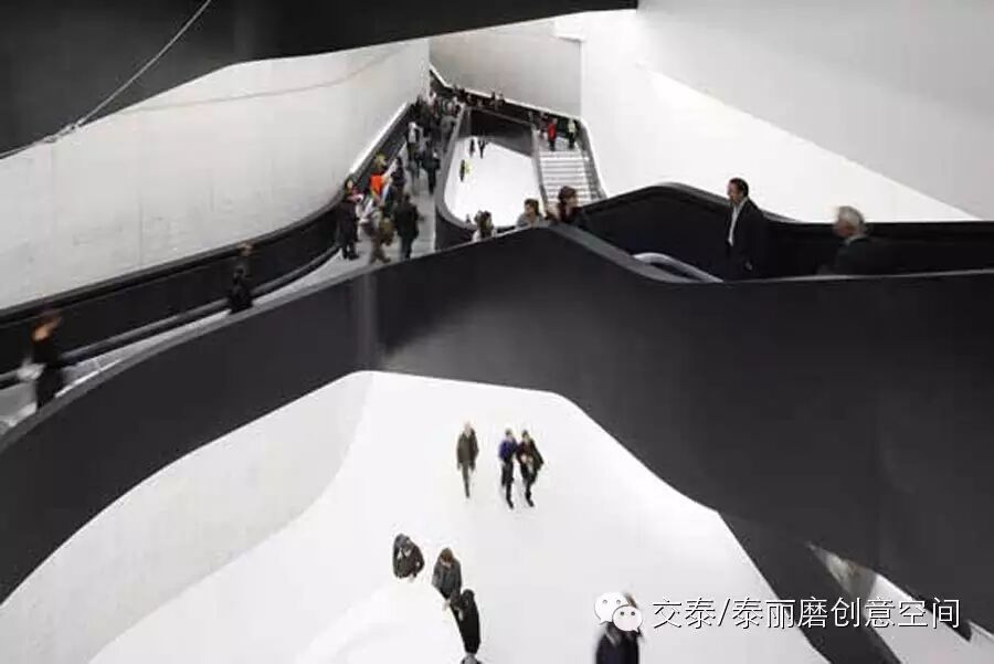 设计师大胆摈弃“博物馆一个个体”的理念,而将其诠释为“多个建筑的集合地”。把博物馆构思为一个动态的公共空间,用混凝土墙、悬浮的黑色楼梯和采纳自然光线的透明屋顶,加上一张城市地毯引导行人穿过一个缓坡进入室内空间。借助悬浮的黑色楼梯元素和采纳自然光线的透明屋顶等元素,创造出多视点和分散几何体,充分展现了新型空间的流动性,以此来象征现代生活的纷杂动感。