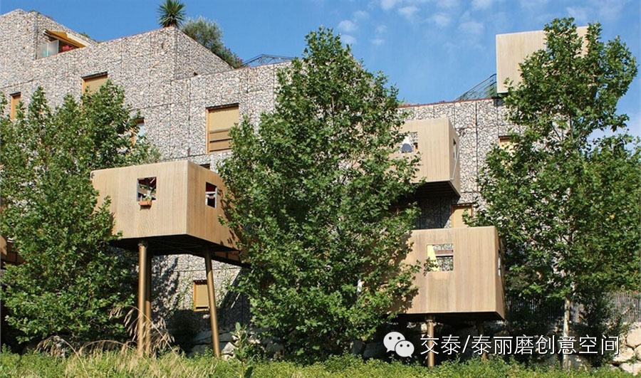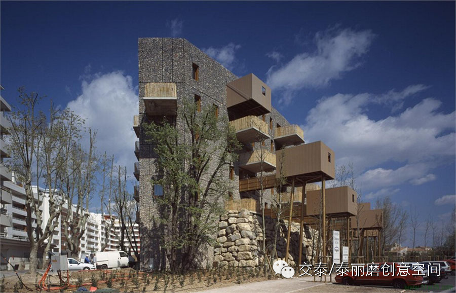 法国的生态公寓由Maison Edouard Franois建筑事务所设计,建筑外墙由岩石、铁丝网和土壤构成,安装有自动灌溉设备,构成微型生态系统,适于植物的生长。